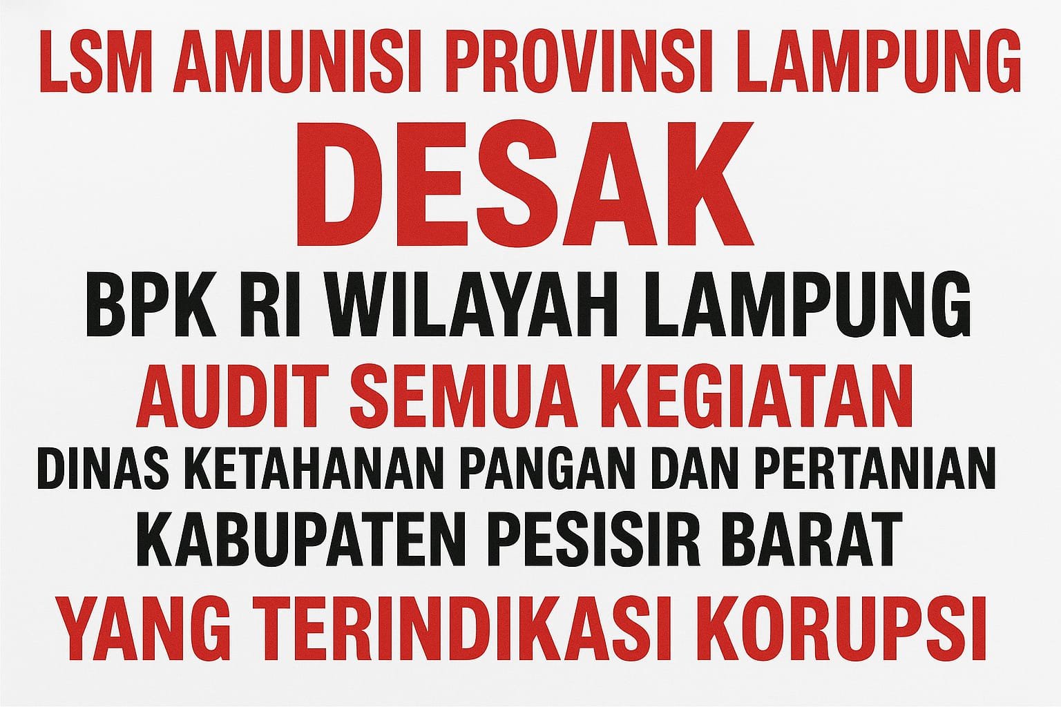 Bandar Lampung, [17, November 2025] – Aliansi Masyarakat Untuk Institusi Provinsi Lampung (AMUNISI) mendesak Badan Pemeriksa Keuangan (BPK) RI dan Kejaksaan Tinggi Lampung untuk melakukan pemeriksaan mendalam terhadap kegiatan dan pengelolaan keuangan Dinas Ketahanan Pangan dan Pertanian Pemerintah Kabupaten Pesisir Barat periode tahun 2024 dan 2025. Desakan ini disampaikan menyusul adanya sejumlah temuan awal yang diduga mengandung indikasi ketidakwajaran dalam pola pengeluaran anggaran.