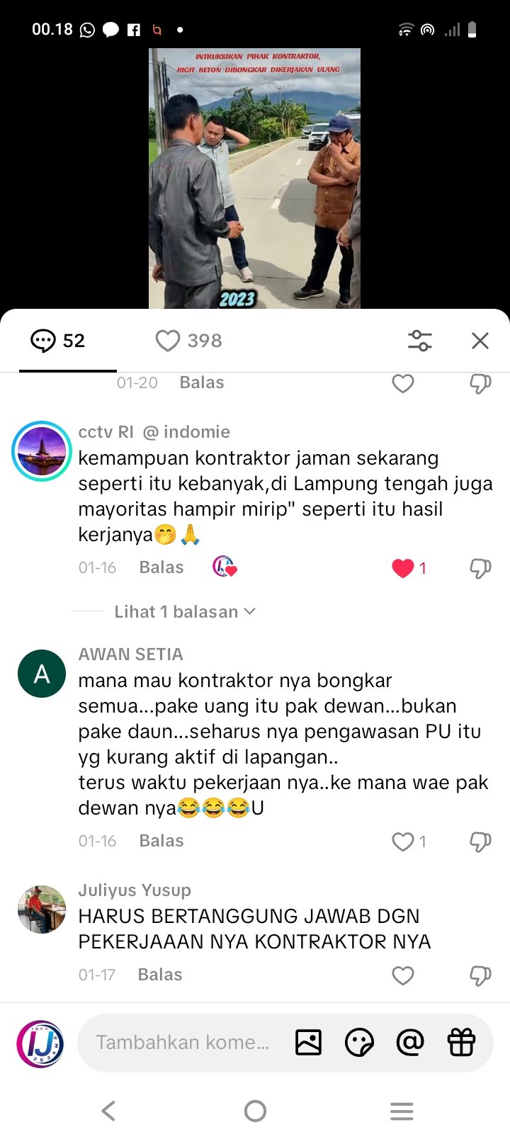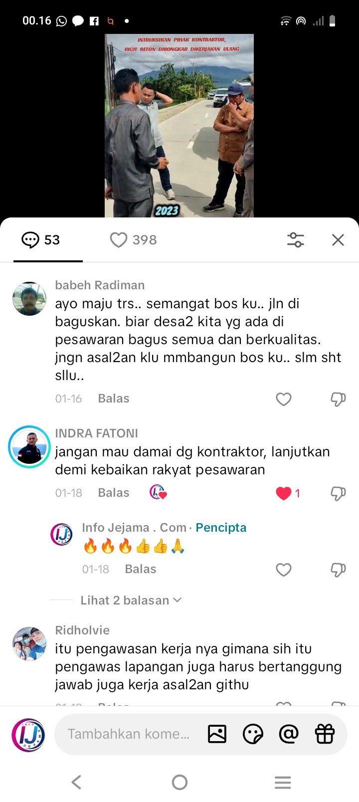 Ada pula yang mempertanyakan fungsi pengawasan di lapangan serta meminta pihak terkait bertanggung jawab atas hasil pekerjaan.