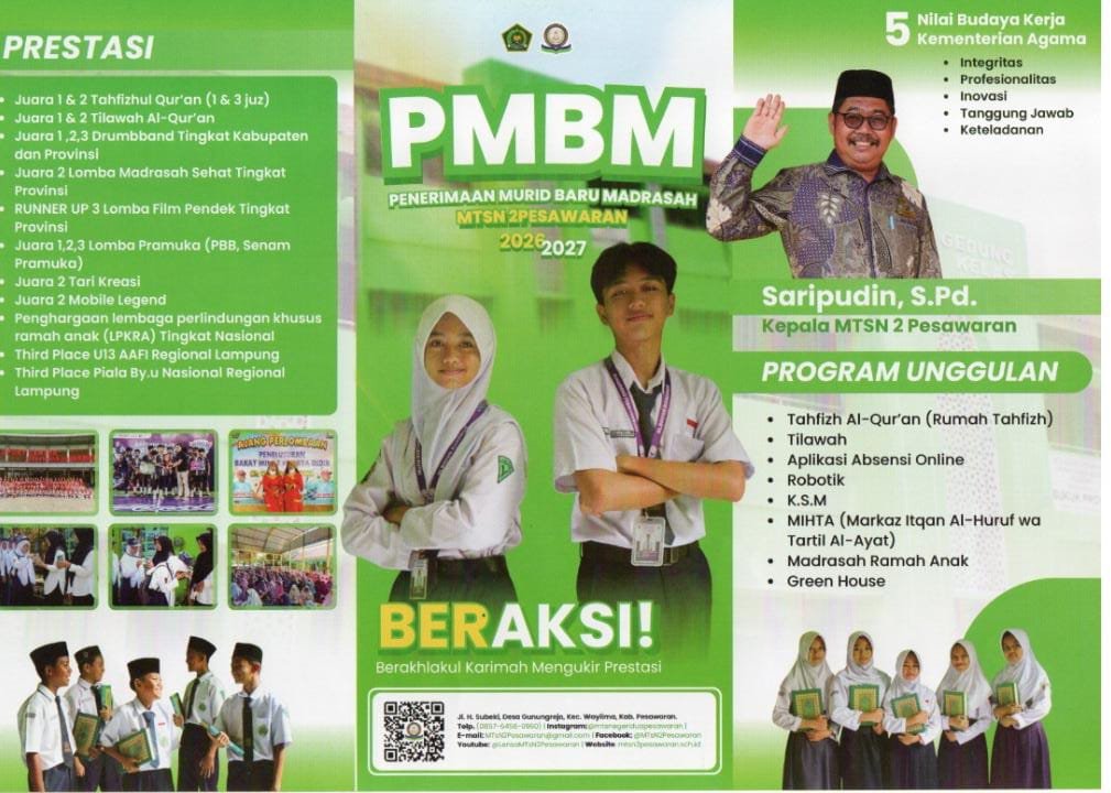 Pesawaran – Madrasah Tsanawiyah Negeri (MTsN) 2 Pesawaran membuka Penerimaan Peserta Didik Baru Madrasah (PMBM) Tahun Ajaran 2026–2027 dengan mengusung tema “Beraksi Berakhlakul Karimah, Mengukir Prestasi.” Program ini menjadi langkah MTsN 2 Pesawaran dalam mencetak generasi muda yang berakhlak mulia, berprestasi, serta memiliki kemampuan akademik dan teknologi yang baik.
