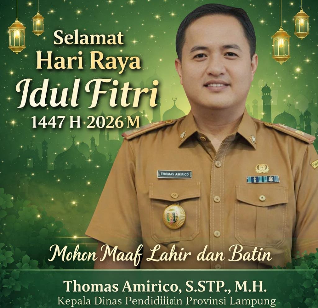 Lebih lanjut, Thomas Amirico juga berharap agar seluruh tenaga pendidik, peserta didik, dan masyarakat dapat menjadikan Idul Fitri sebagai titik awal untuk memperbaiki diri dan meningkatkan kualitas dalam berbagai aspek kehidupan, khususnya dalam dunia pendidikan di Provinsi Lampung.