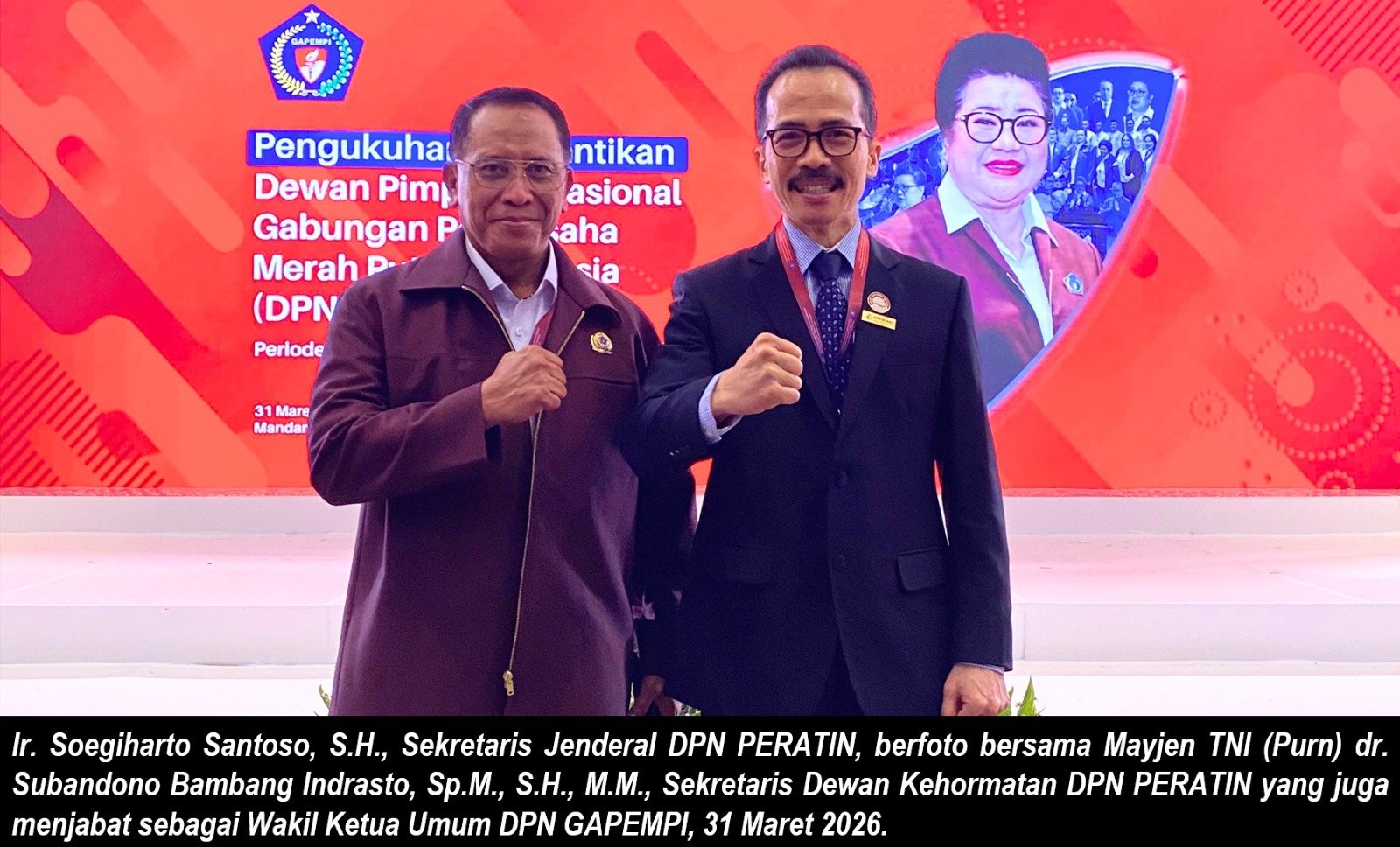 Dalam kesempatan tersebut, Ketua Umum DPP APTIKNAS sekaligus Sekretaris Jenderal DPN PERATIN, Ir. Soegiharto Santoso, S.H., (Hoky), menyampaikan apresiasi atas pengukuhan kepengurusan DPN GAPEMPI periode 2026–2031 di bawah kepemimpinan Minarni L. Panggabean, S.H., M.H. Menurutnya, kehadiran GAPEMPI sebagai organisasi pengusaha Merah Putih merupakan kekuatan strategis dalam memperkuat ekosistem ekonomi nasional yang inklusif, berdaya saing, serta berlandaskan kepastian hukum.