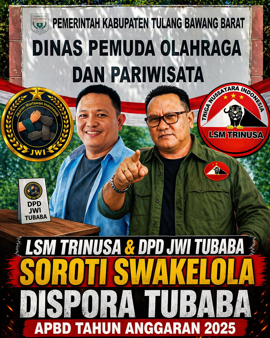 INFOJEJAMO.COM//TULANG BAWANG BARAT – Dewan Pimpinan Cabang (DPC) Lembaga Swadaya Masyarakat (LSM) Triga Nusantara Indonesia (TRINUSA) bersama Dewan Pimpinan Daerah (DPD) Jajaran Wartawan Indonesia (JWI) Kabupaten Tulang Bawang Barat (Tubaba) resmi menyoroti alokasi anggaran swakelola pada Dinas Pemuda dan Olahraga (Dispora) Kabupaten Tubaba tahun anggaran 2025.