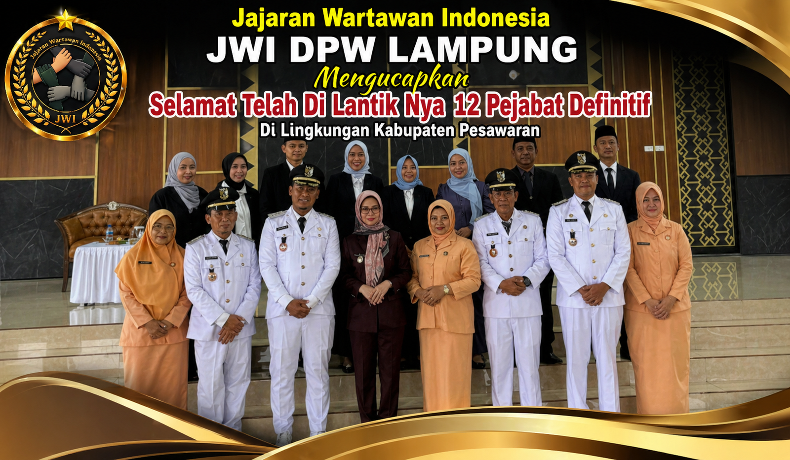 Pesawaran — Jajaran Wartawan Indonesia (JWI) Dewan Pimpinan Wilayah (DPW) Lampung menyampaikan ucapan selamat kepada 12 pejabat yang resmi dilantik di lingkungan Pemerintah Kabupaten Pesawaran. Pelantikan tersebut menjadi bagian dari penguatan struktur birokrasi guna meningkatkan pelayanan publik dan kinerja pemerintahan daerah.