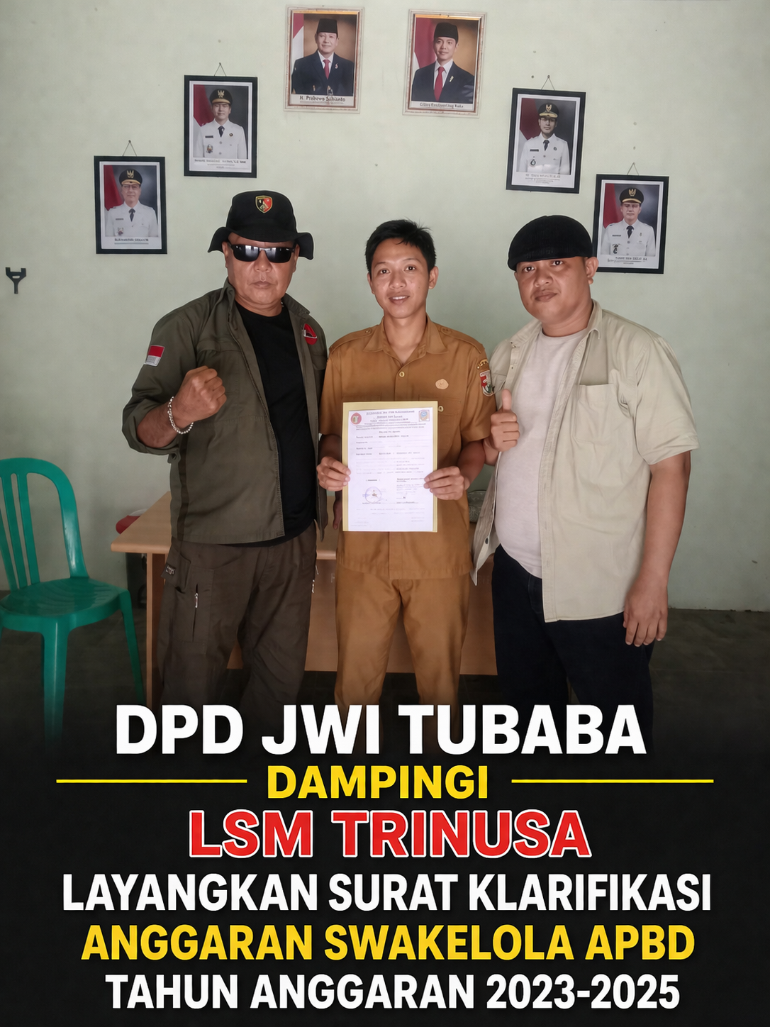 INFOJEJAMA.COM//TULANG BAWANG BARAT– Lembaga Swadaya Masyarakat Triga Nusantara Indonesia (LSM TRINUSA) DPC Tulang Bawang Barat, yang didampingi oleh Organisasi Profesi Pers Jajaran Wartawan Indonesia (JWI) DPD Tulang Bawang Barat, resmi melayangkan surat permintaan data dan klarifikasi kepada Dinas Pemuda, Olahraga, dan Pariwisata (Dispora) Kabupaten Tulang Bawang Barat, Senin.27.April.2026. Langkah ini diambil guna mempertanyakan transparansi realisasi anggaran swakelola yang bersumber dari APBD Tahun Anggaran 2023-2025 di instansi tersebut.