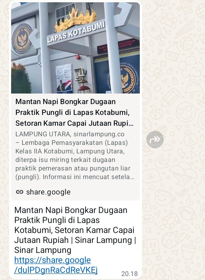 Mantan Napi Bongkar Dugaan Praktik Pungli di Lapas Kotabumi, Setoran Kamar Capai Jutaan Rupiah | Sinar Lampung | Sinar Lampung https://share.google/dulPDgnRaCdReVKEj